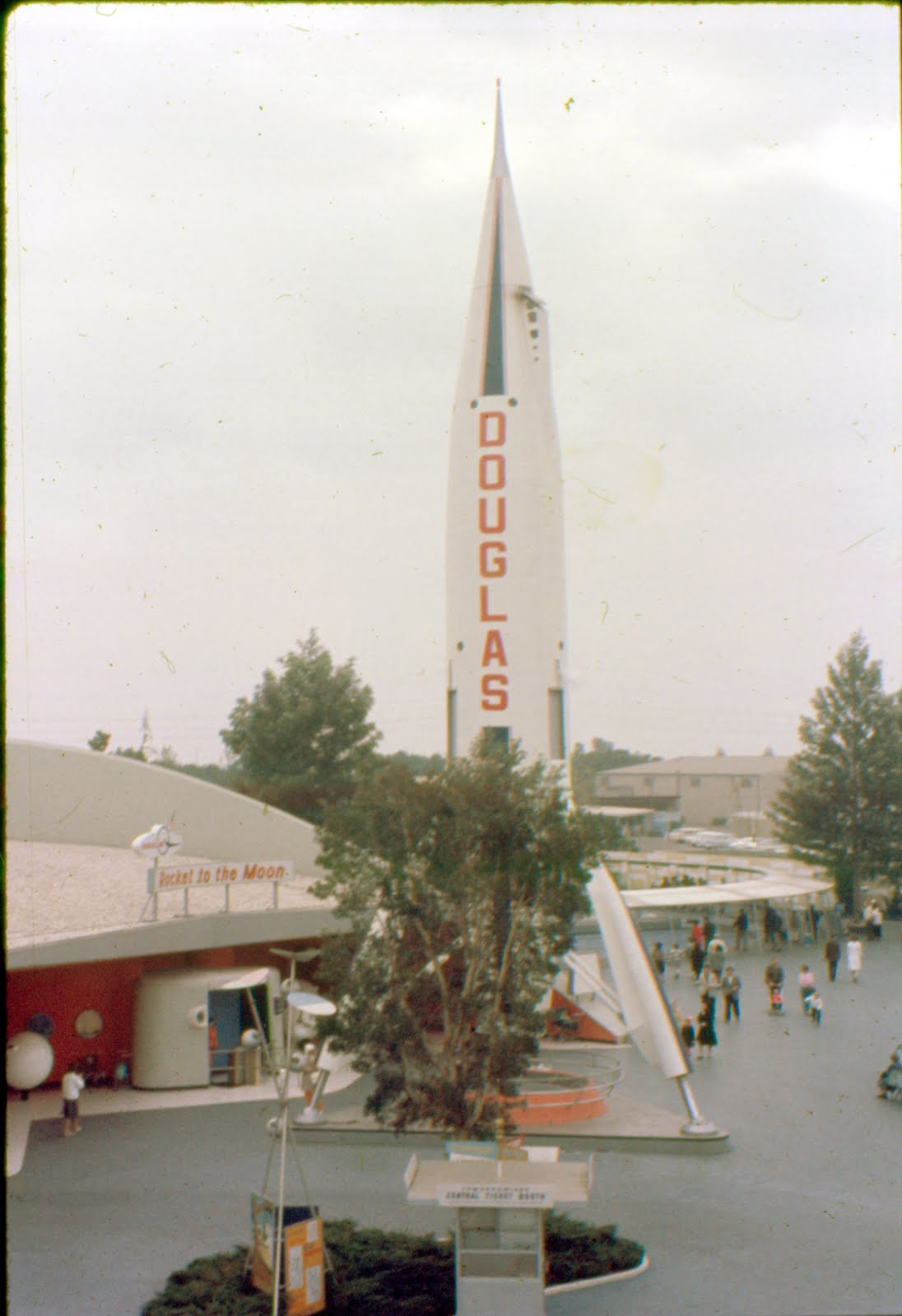 Douglas has hi-jacked the Rocket to the Moon. I see a ticket booth, attraction posters, the flying saucers and a super cool entrance to the Rocket to the Moon.