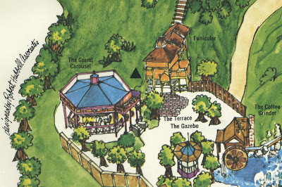 This view is a little difficult to get today, everything is still there, but there's a large tree in the way and as you can see, The Gazebo grew some extensions when it became the Carousel Bandstand (I recall "Saturday, in the park, I wish it was the fourth of July" used to echo from the speakers in the bandstand when the park opened in the mornings).