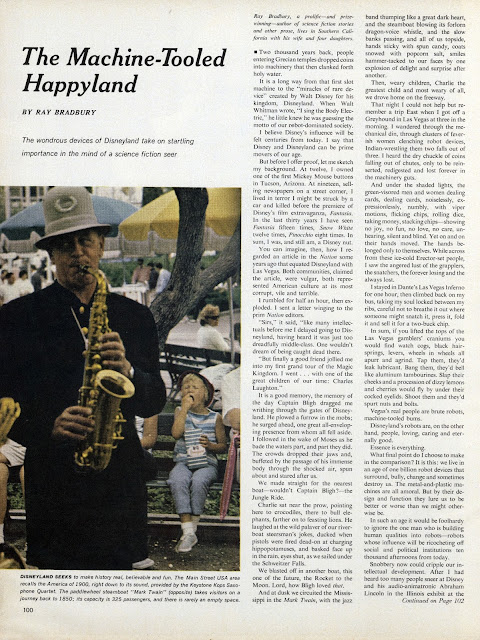 100 Disneyland magazine articles and this Ray Bradbury article is not like any of them. Maybe it was his special relationship with Walt? Until recently I didn't know Ray and Walt knew each other. While preparing for next weeks Magazine Monday, I found this (